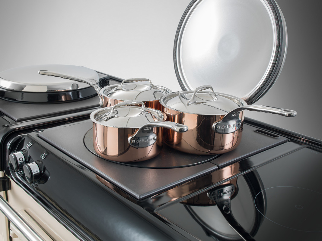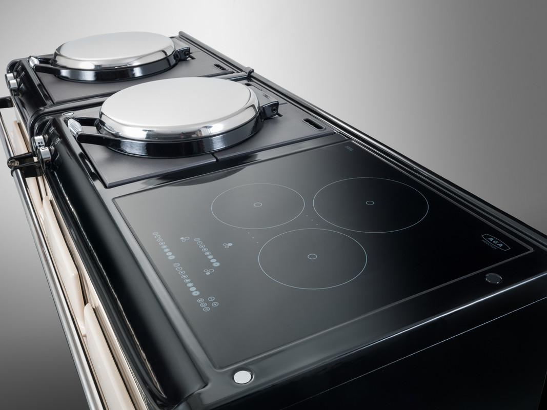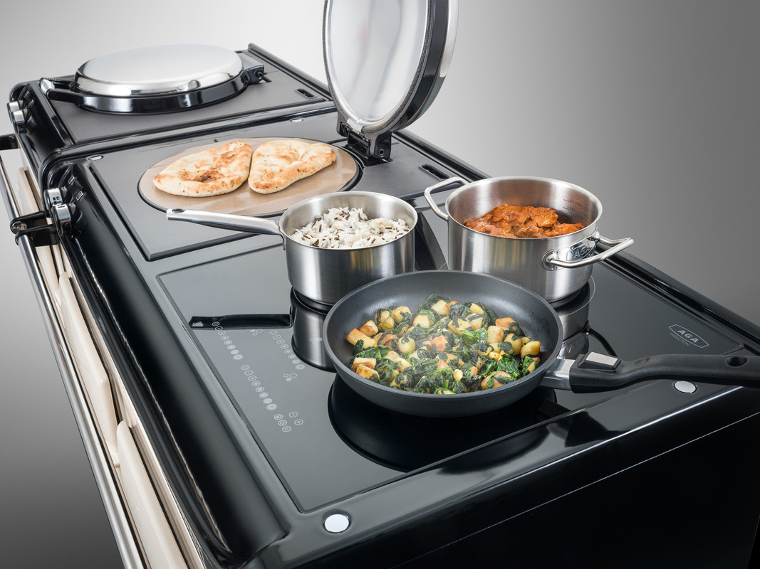 This range cooker is the first AGA cast-iron cooker to feature a generous 90-litre capacity conventional oven, as well as two highly efficient hotplates, one which can be set to either boiling or simmering and one for simmering. This model is complemented by a state-of-the-art three-zone induction hob with a bridging feature, ideal for use with a griddle plate, fish kettle or other large cookware.