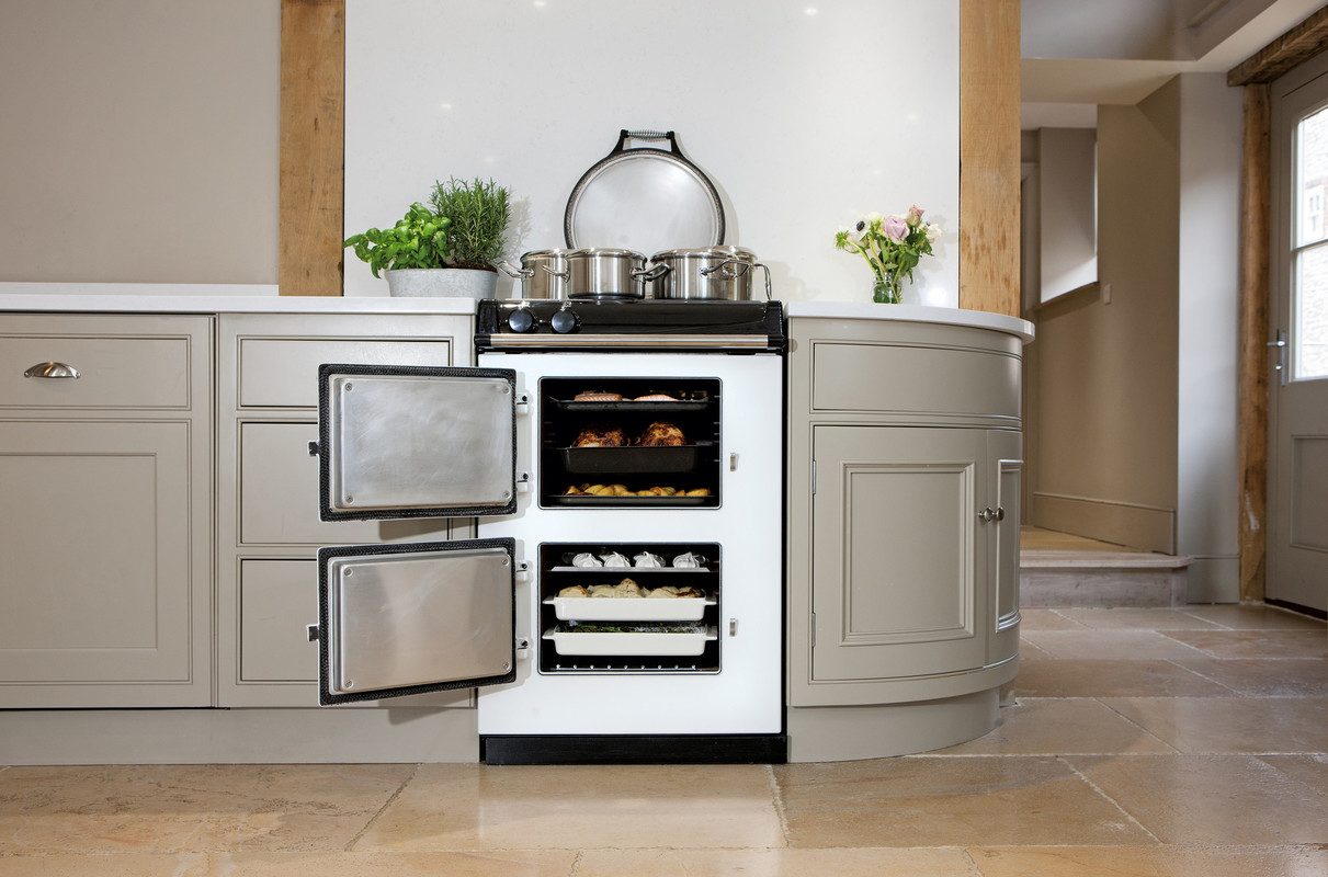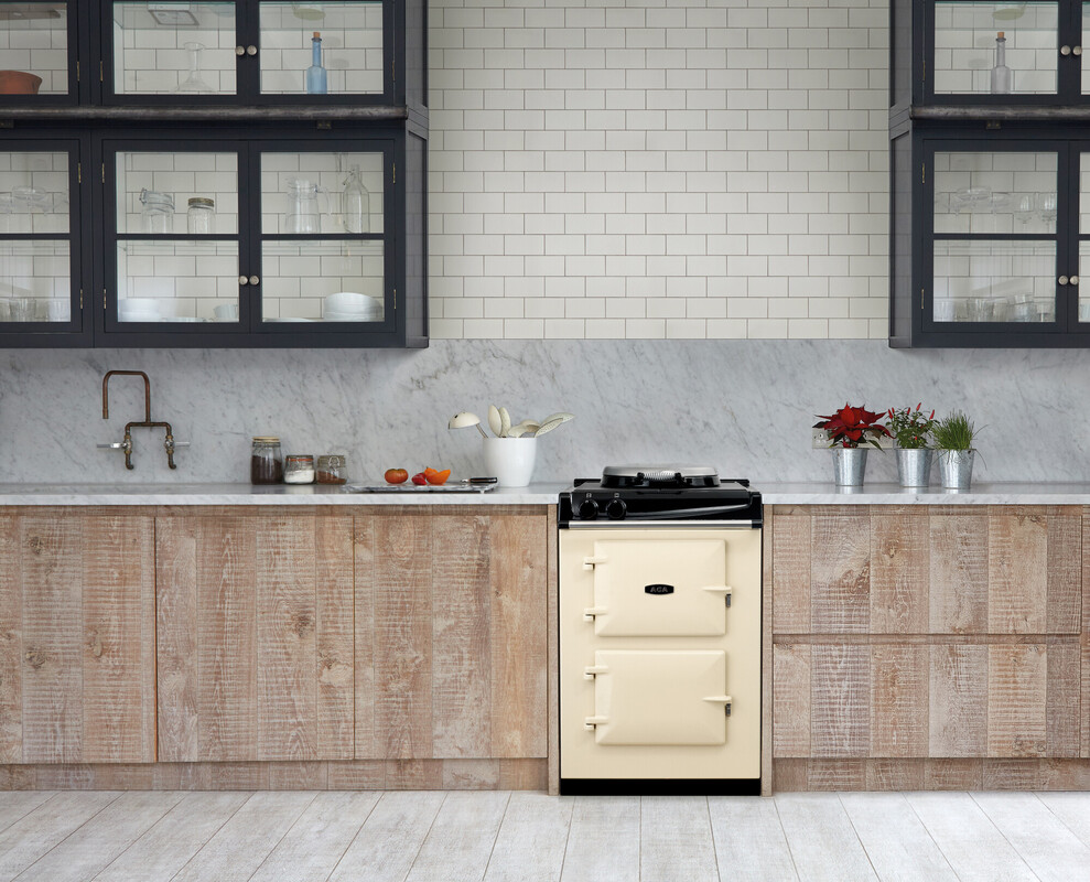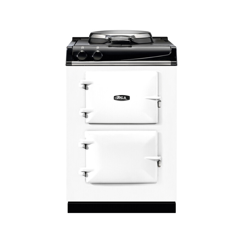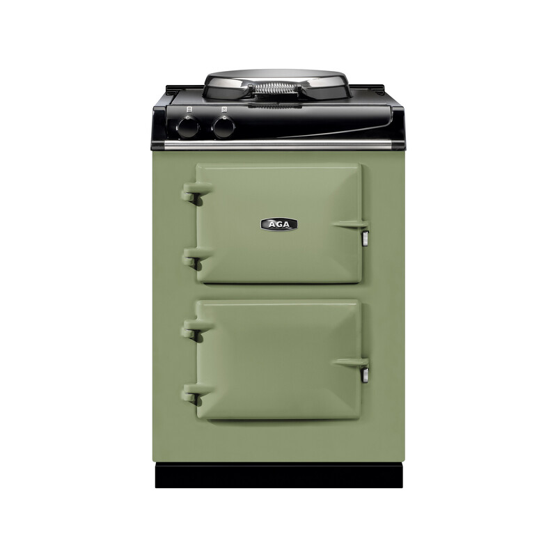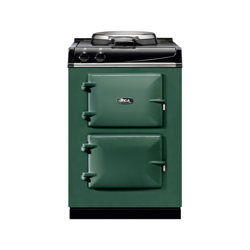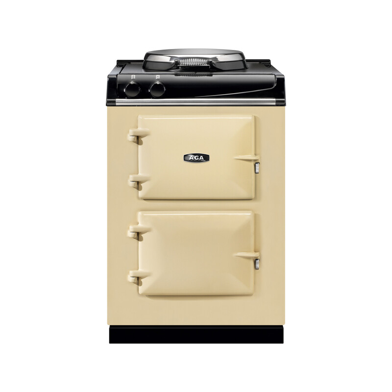 This small range cooker runs on electricity and requires no servicing, no plinth and no flue, so it’s easy to install and run., Ideal for smaller kitchens, the AGA 60 is just 60cm wide and has everything you’d want from an AGA, including an iconic hotplate and the ability to put gentle heat into the room. With two cast-iron ovens, it uses even, radiant heat to ensure great cooking results.