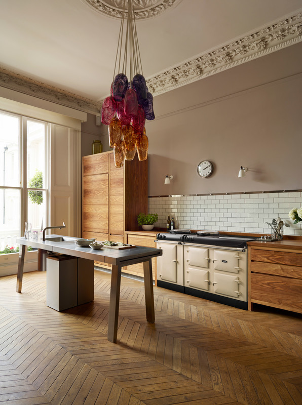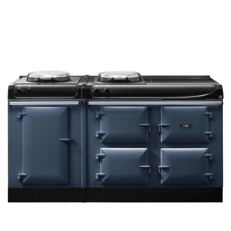The AGA R3 Series 170 features a cast-iron roasting oven, an enamelled baking/simmering oven as well as a warming oven and an integrated, infrared grill. This model also features an iconic AGA hotplate, which can be used for boiling or simmering, and a state-of-the-art three-zone induction hob.