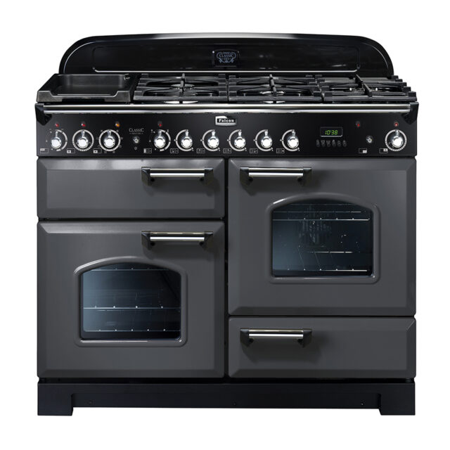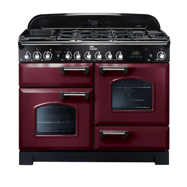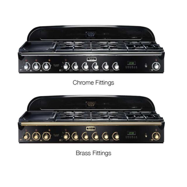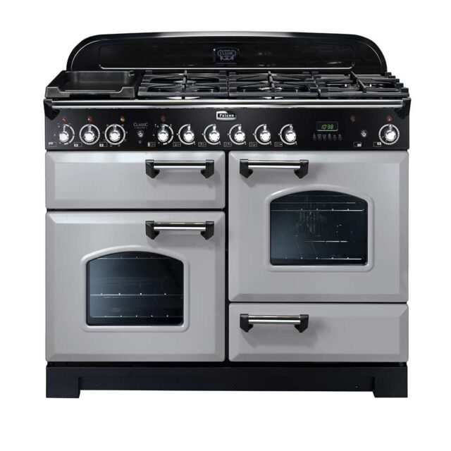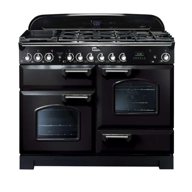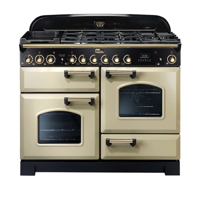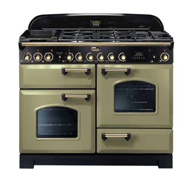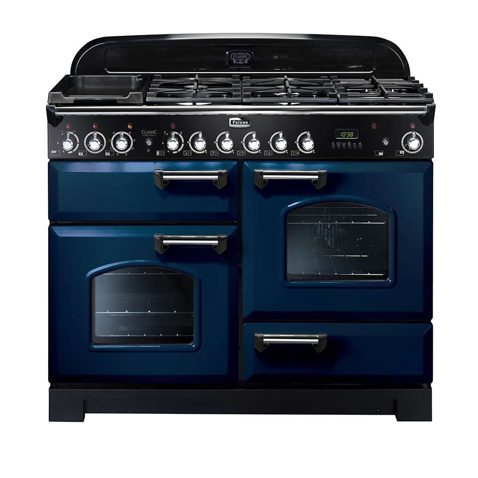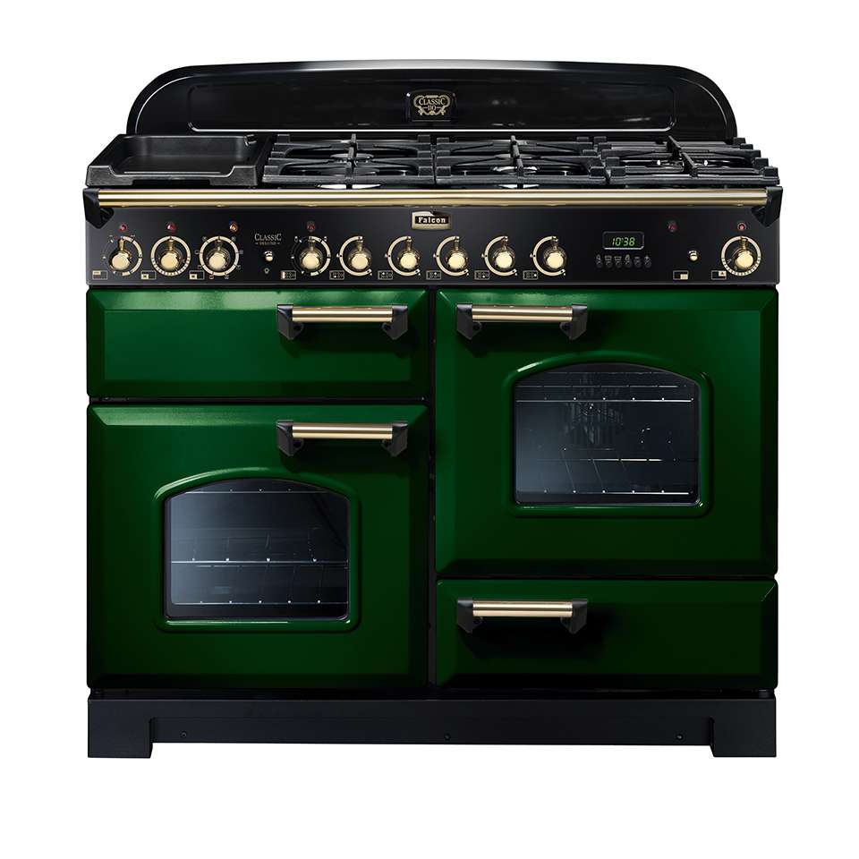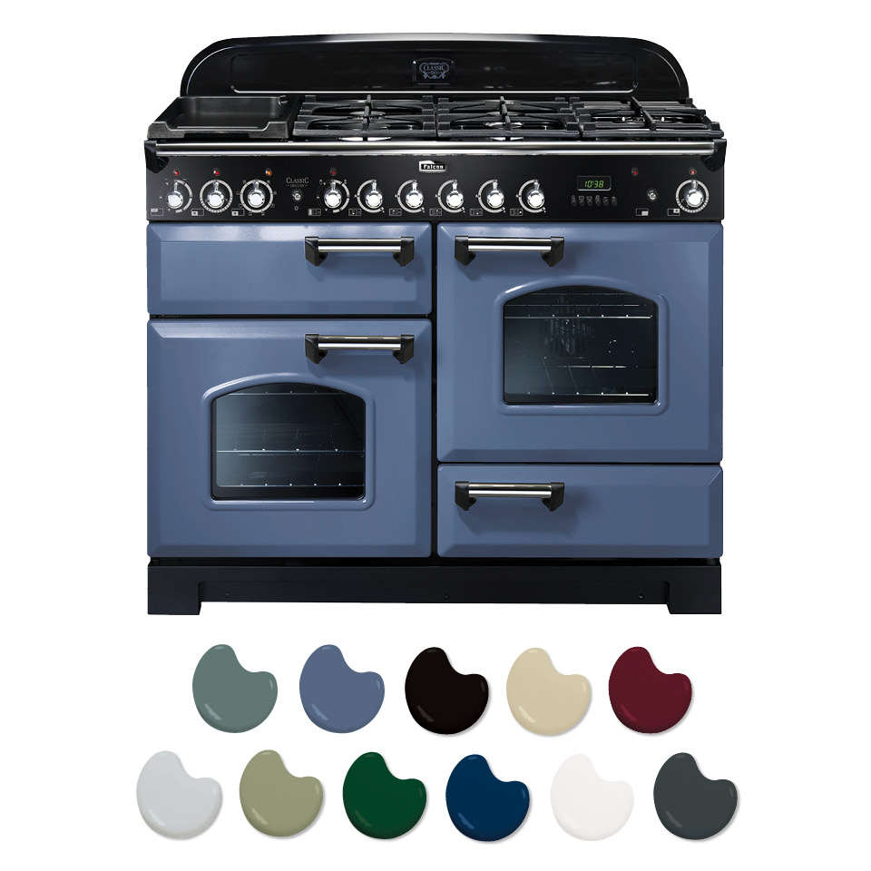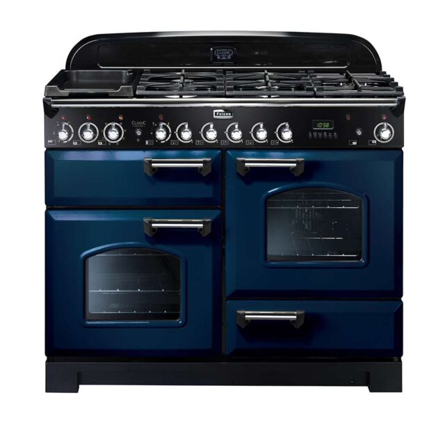 Past of one of our most popular collections, the super-sleek Falcon Classic Deluxe 110cm Dual Fuel Range Cooker is available in eleven colours with a choice of chrome or brass* trims. Dual fuel offers the best of both worlds with a responsive gas hob and the flexibility and even heat distribution of dual electric ovens. Classic Deluxe also offers Rapid Response for faster heat-up times, so no need to pre-heat the oven as well as the Handyrack, bread proving drawer (110cm), programmable oven, wok cradle and multi-ring burner.